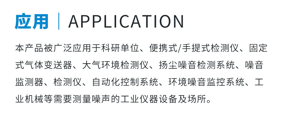 應用 : 本產品被廣泛應用于科研單位、便攜式/手提式檢測儀、固定式氣體變送器、大氣環境檢測儀、揚塵噪音檢測系統、噪音監測器、檢測儀、自動化控制系統、環境噪音監控系統、工業、廠房等需要測量的場所