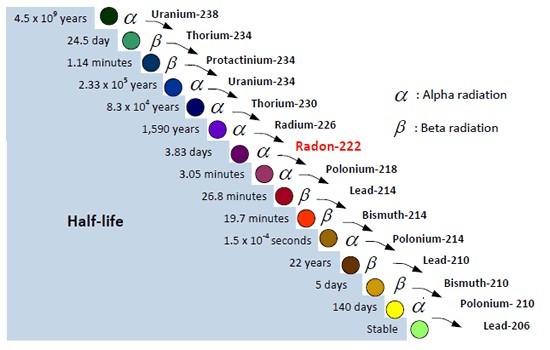 由于鈾發生放射性衰變,它發出的α,β和γ射線,隨著一系列產品,其中包括氡。 反過來,通過一系列的四個壽命極短的放射性氡衰變產物,在固體,帶電粒子被稱為氡子體 :釙218,引線214,鉍- 214的形式,氡衰變和釙214。