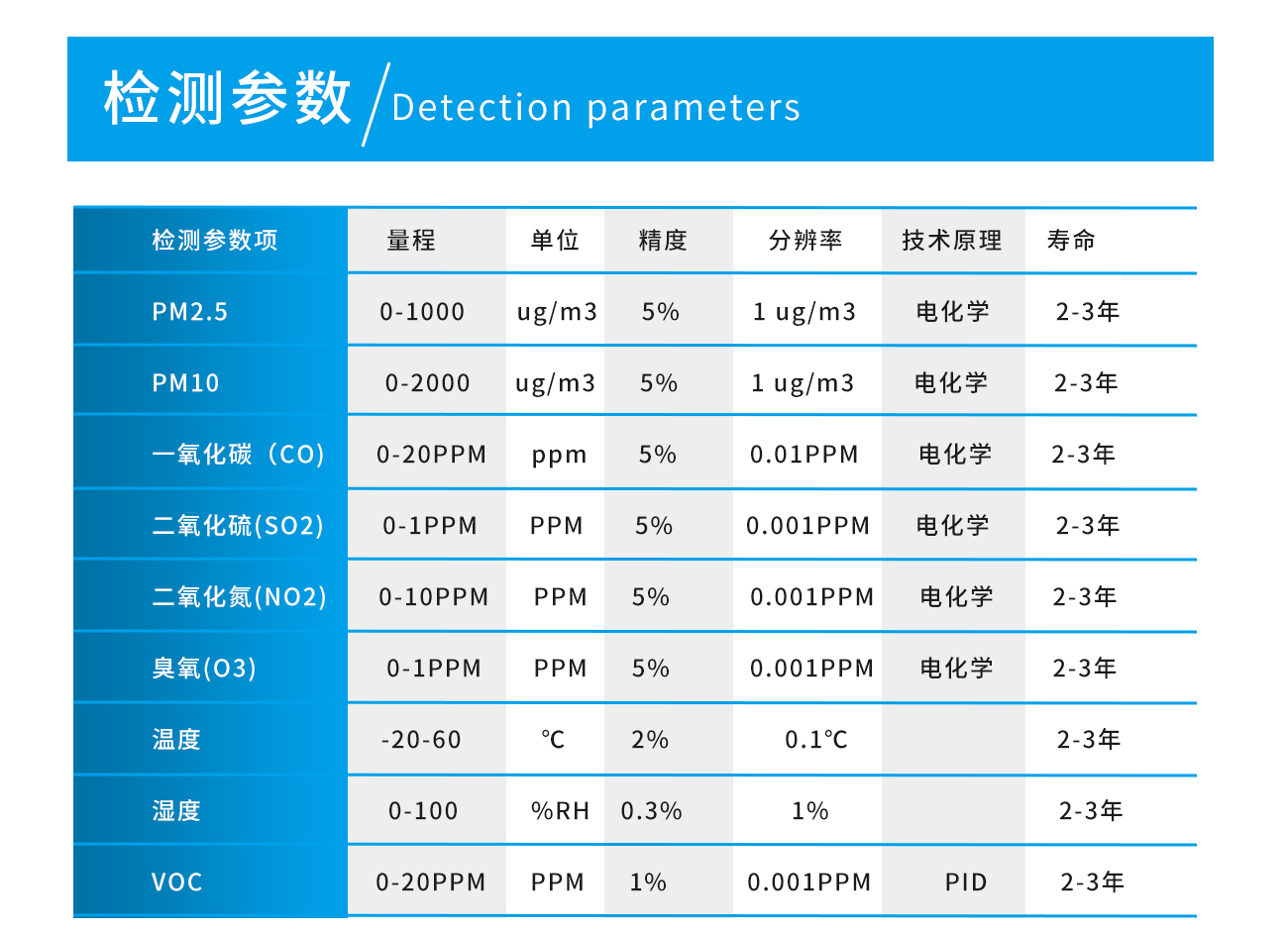 檢測原理: CO, SO2, NO2, O3:電化學 PM2.5,PM10:激光 TVOC:PID光離子